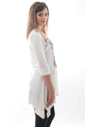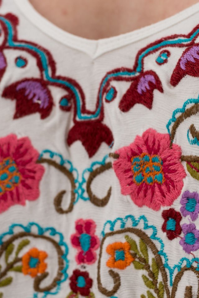 Bluza alba cu broderie multicolora, cu elemente florale si decorative pe partea din fata. Textura fina si moale a vascozei imbinata cu elastitatea spandexului dau combinatia perfecta pentru o tesatura comoda si relaxanta de care sa te bucuri intreaga zi.