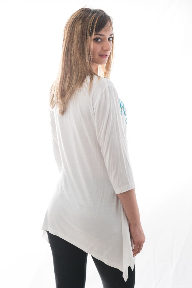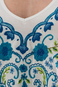 Bluza alba cu broderie bleo, turcoaz, verde, cu elemente florale si decorative pe partea din fata. Textura fina si moale a vascozei imbinata cu elastitatea spandexului dau combinatia perfecta pentru o tesatura comoda si relaxanta de care sa te bucuri intreaga zi.