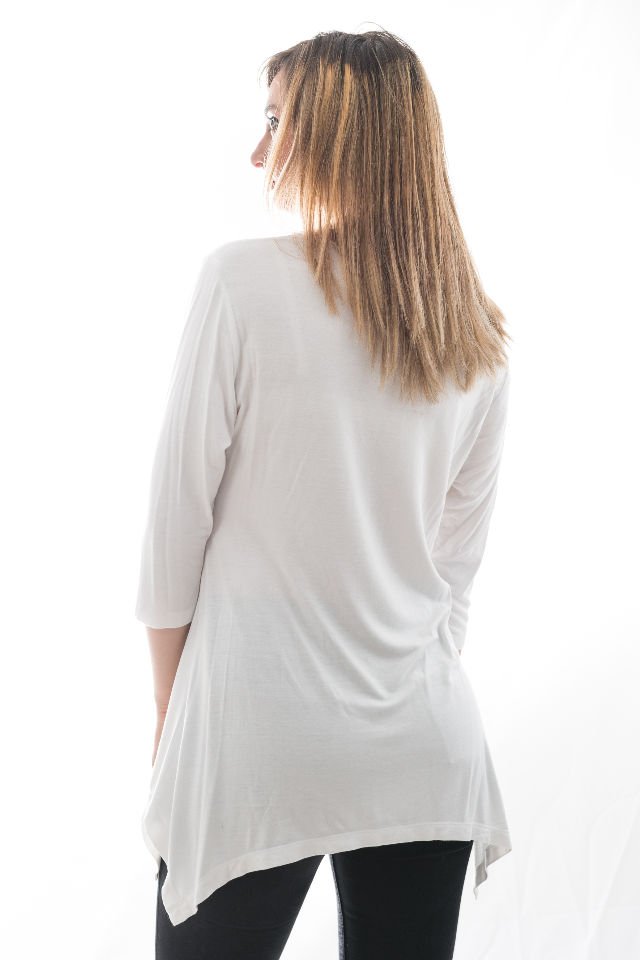 Bluza are decolteu in V si croiala evazata terminata in colturi evidentiind linia taliei. Cu lungimea putin peste sold, maneca 3/4, bluza este perfecta pentru egari sau blugi skinny.