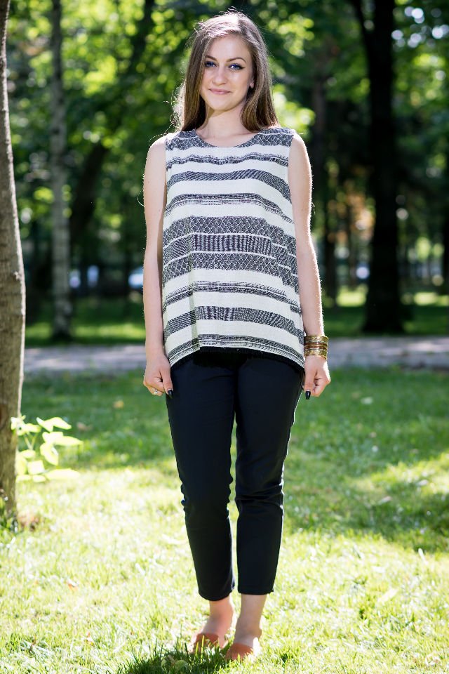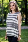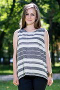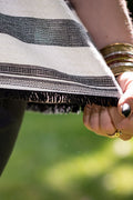 Bluza lejera, croiala dreapta, chimono cu design in dungi late orizontale albe si gri, cu franjuri negri la termintia bluzei.