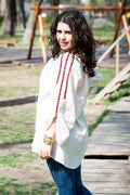 Inspirata din portul traditional romanesc, bluza tip ie din Colectia Ninete a fost creata cu suflet, special pentru tine. Facuta din cel mai fin bumbac natural, pentru ca tu sa te simti foarte comfortabila, in culoarea ivory si innobilata cu broderie fina rosu-grena pentru un contrast de senzatie.