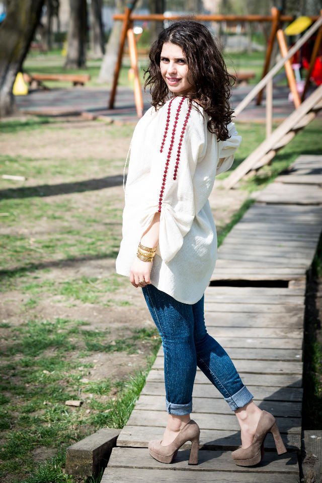 Maneca lunga, larga este prevazuta cu o clapeta cu nasture si se poate ajusta in lungime devenind maneca 3/4. Cu lungimea putin peste sold, bluza este perfecta atat la jeans skinny penru o tinuta moderna si comfortabila dar cu o nota traditionala, dar perfect asortata si la fuste de orice fel.