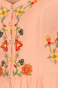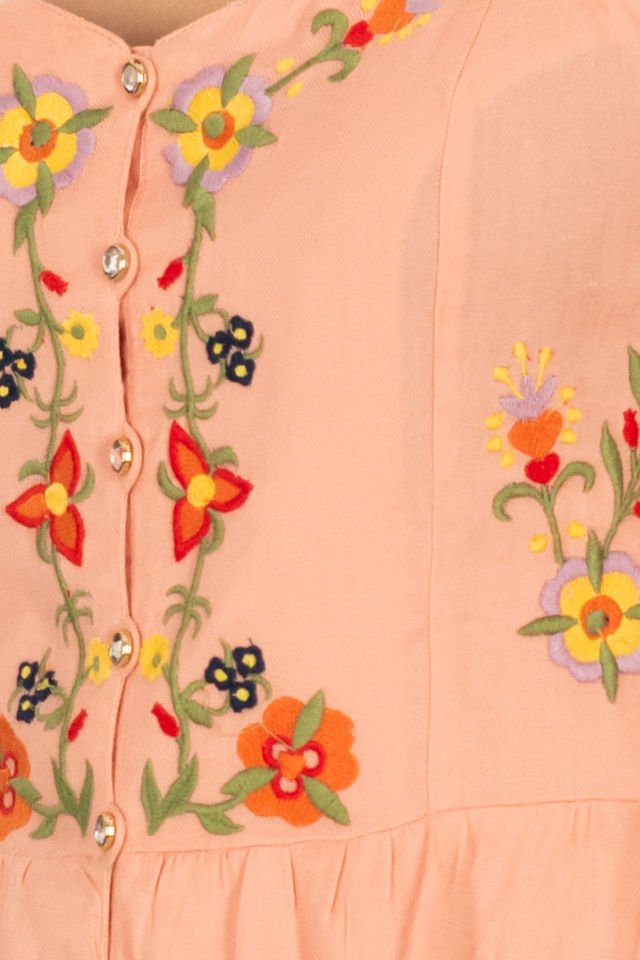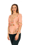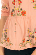 Bluza eleganta cu broderie florala deosebita, cu decolteu amplu, maneca 3/4, cu taietura pe linia taliei,incheiata cu nasturi decorativi.