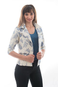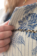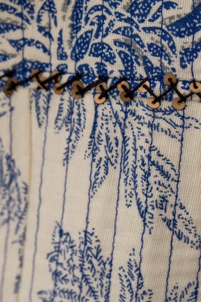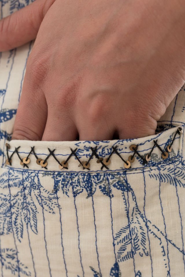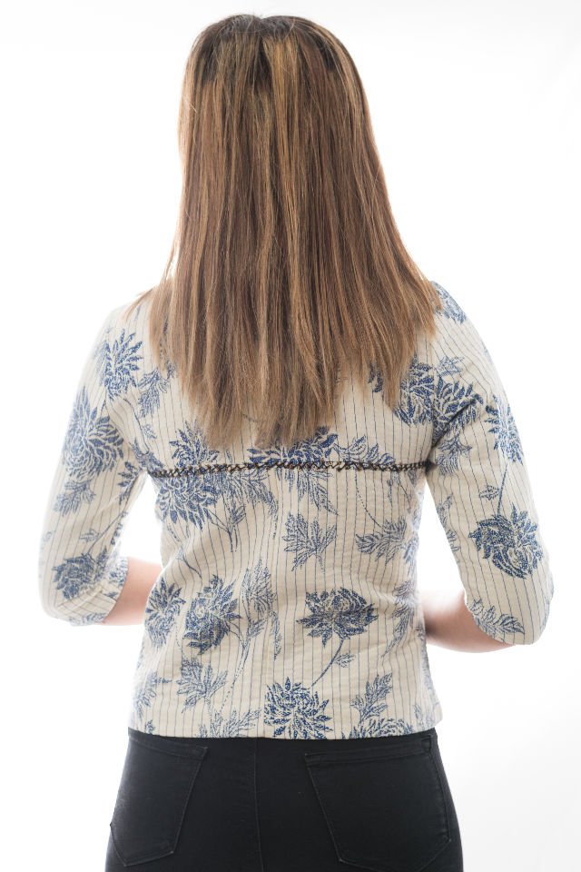 Crem cu print floral albastru si cusaturi decorative verticale albastre, cu model aplicat de paiete vintage la buzunare si pe linia bustului, piesa este o incantare pentru garderoba ta, usor de asortat atat cu blugi cat si cu fuste, un "casual" practic si comod pentru orice moment al zilelor racoroase.
