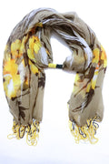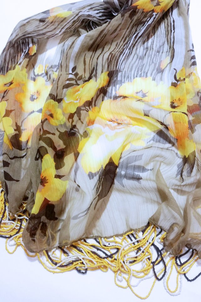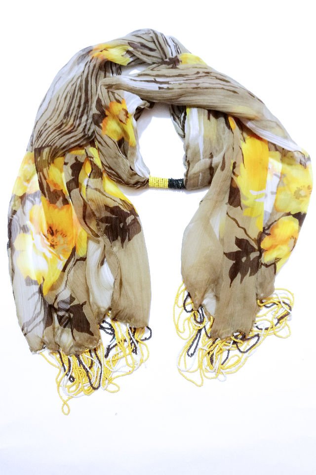 Increderea in tine este cea care straluceste cu adevarat dar stilul Cara ofera o stralucire in plus. Pentru ca tu sa stralucesti ca un star noi iti oferim o bijuterie de esarfa lucrata manual accesorizata cu margele mici galben, maro, alb. Esarfa din rayon cu desen floral maro-orange are capetele franjurate cu margele.