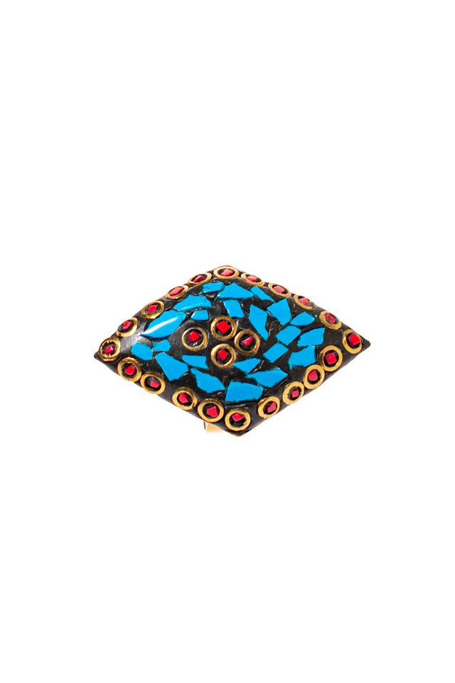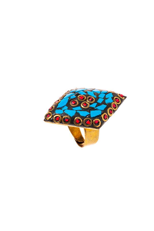 Cara iti propune acest Inel metalic aurit in forma de romb cu model mozaic albastru si rosu cu finisaj antichizat.