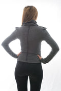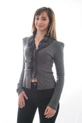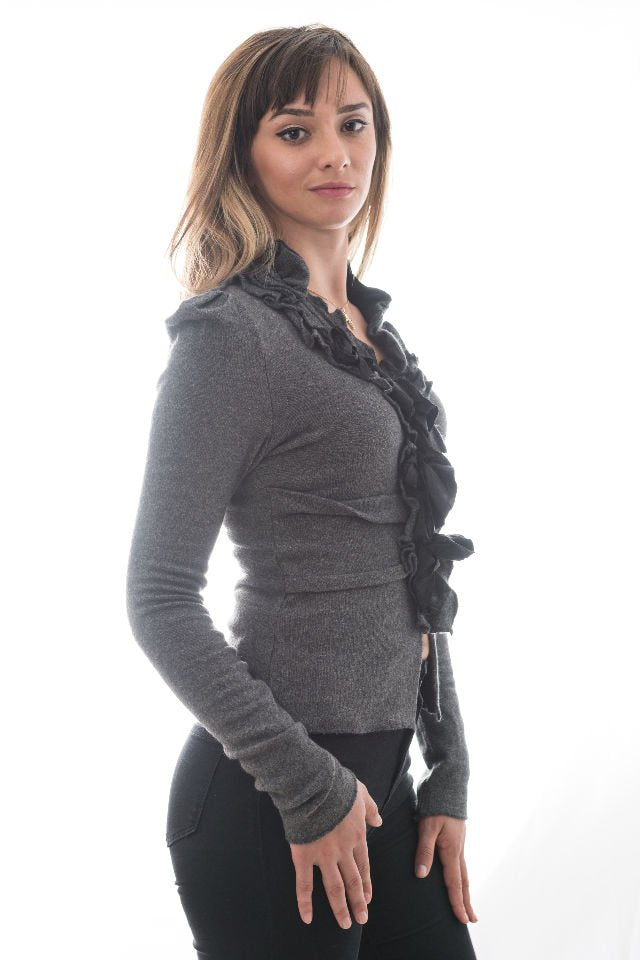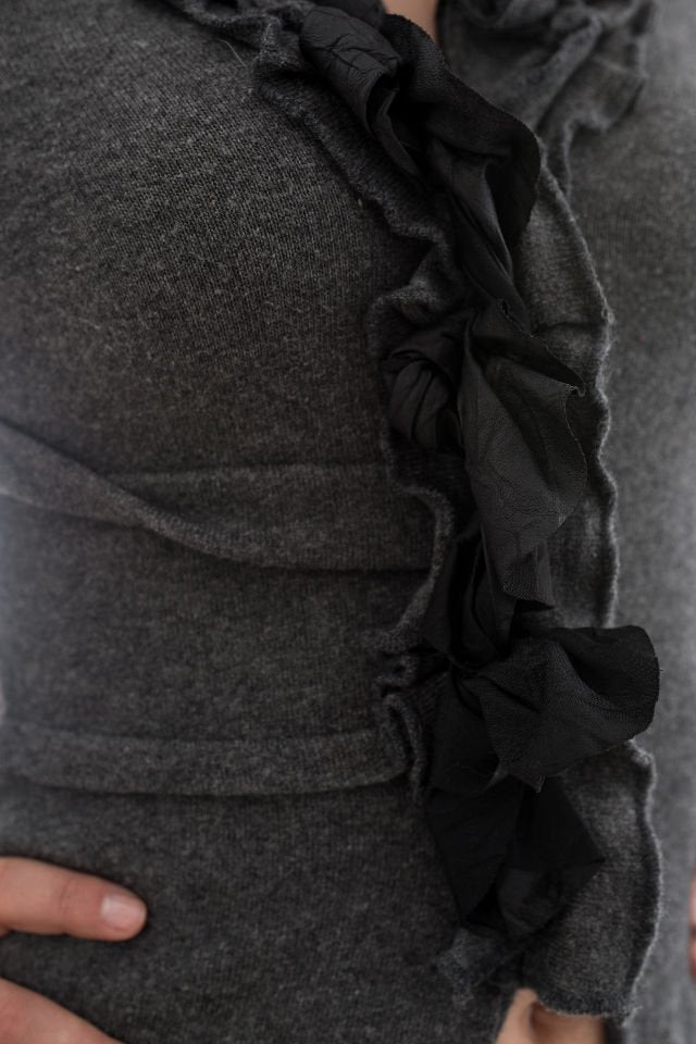 Pulover gri tricotat, cu volane si elemente decorative din piele ecologica.