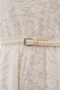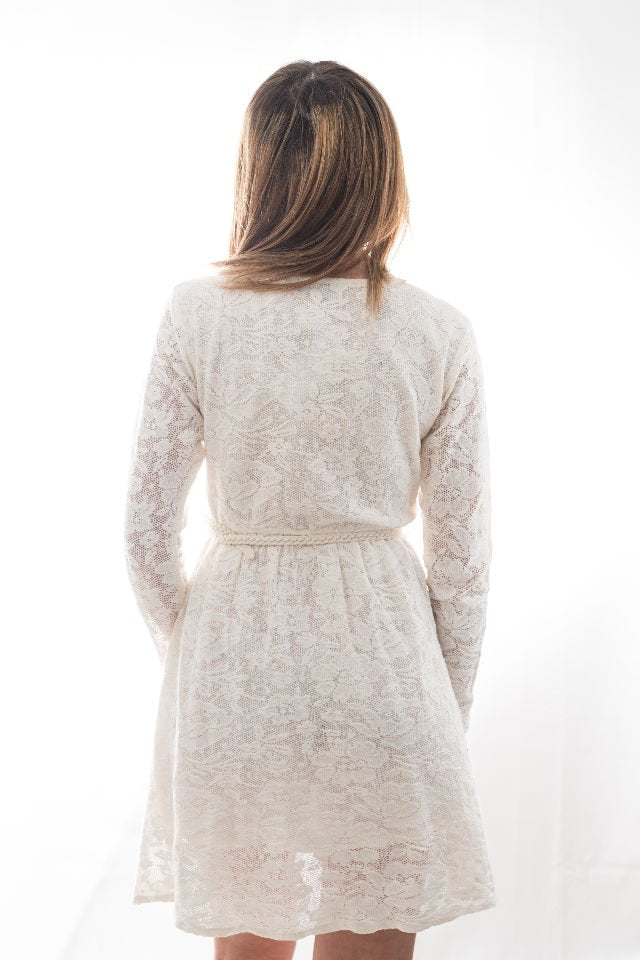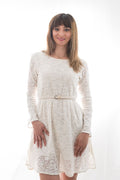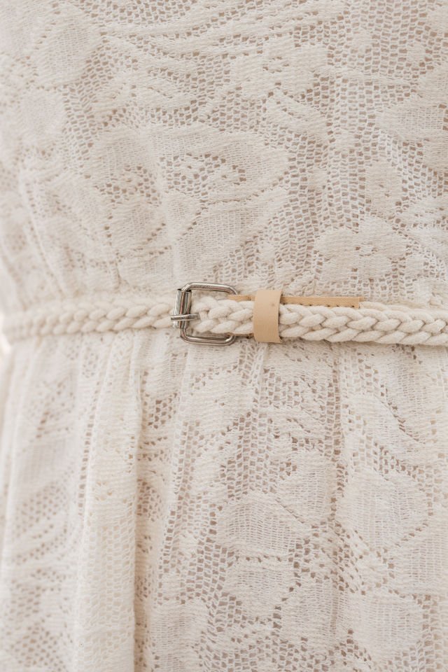 Rochie dantela croset de bumbac, lungime medie, maneca lunga, decolteu barcuta si fusta larga, prevazuta in talie cu o curea de bumbac impletita. Rochia este prevazuta cu o captuseala de bumbac fin.