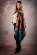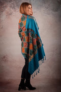 Șal albastru din lână reversibilă cu broderie hand made India. Are un superb model traditional indian floral si paisley – un model de diferite forme curbe in culori diferite pe panza – care este complet reversibil.