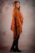 Șal teracota din lână reversibilă cu broderie hand made India. Are un superb model traditional indian floral si paisley – un model de diferite forme curbe in culori diferite pe panza – care este complet reversibil.